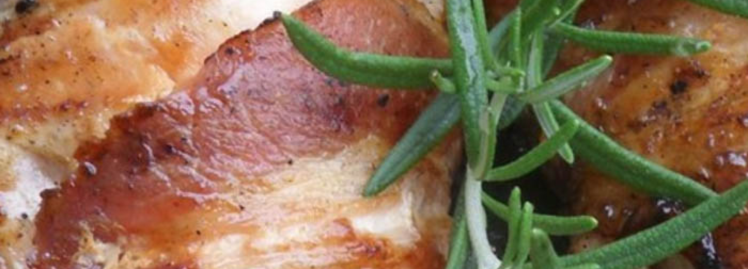 - Lay one rosemary sprig on the chicken breast. Wrap the bacon around the chicken to hold the rosemary on. Secure the bacon with a toothpick or an additional thick rosemary stem.