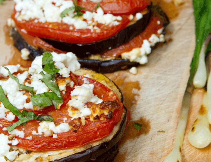 - Lightly oil the baking pan. Arrange 4 eggplant rounds side by side. Spread ½ tablespoon of the basil-garlic mixture on top of each one, then generously sprinkle feta crumbs. Top each with tomato rings. Add another layer of eggplant, basil spread, feta and tomato rounds and top with the rest of the crumbled feta.