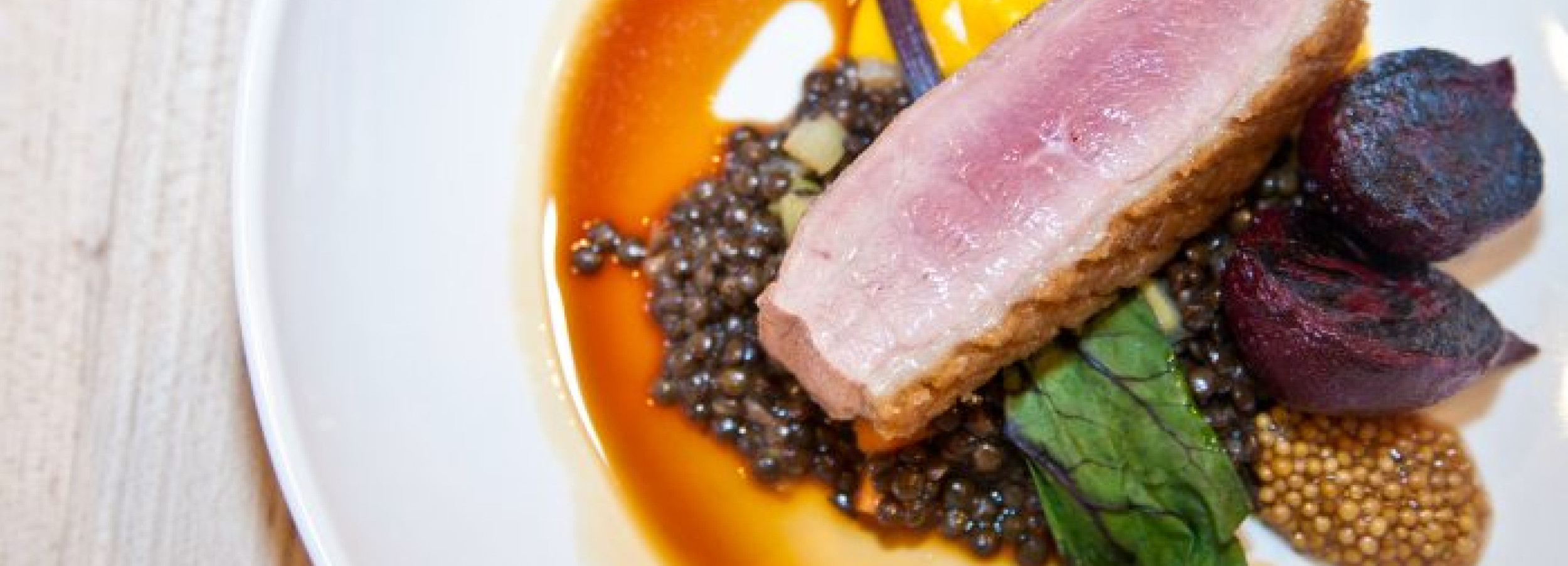 - Score the fat of the duck breast, season with salt, pepper and Five-spice.